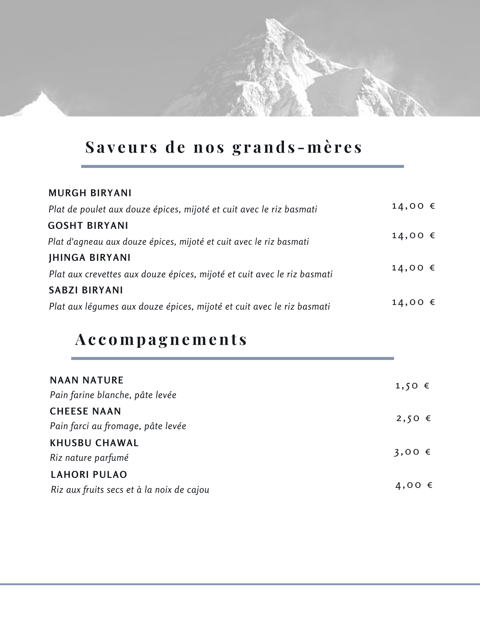 Cher client, attachez vos ceintures direction les monts du Pakistan au sommet du K2. L'ascension commence par un somptueux décors et ambiance traditionnelle afin de vous dépayser à souhait. S'en suit d'une cuisine typique et épicée dans les règles de l'art faisant découvrir de nouvelles saveurs. Oubliez la descente en rappel, vous repartirez en roulant de part les portions généreuses que nous servent les deux aimables gérants.