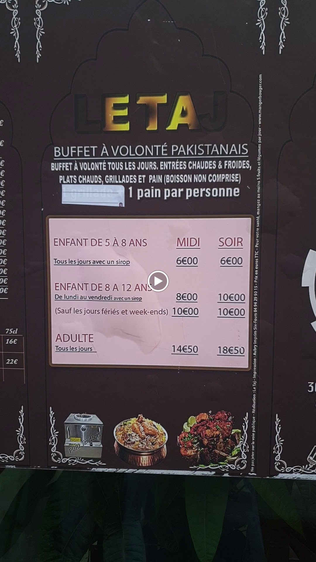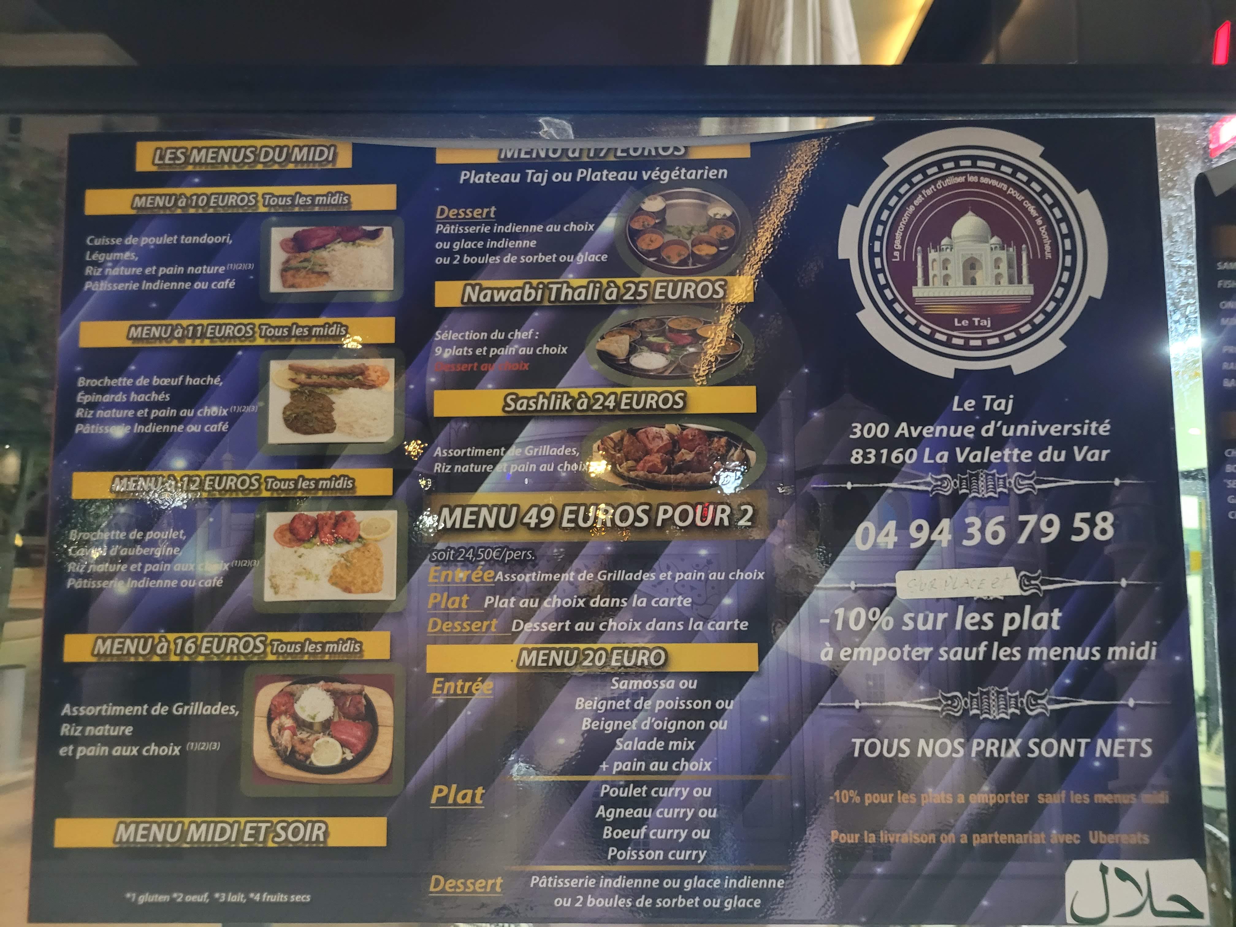 Accueil sympathique. Bon d'abord quand on se dit restaurant pakistanais, on s'appelle pas Taj avec reproduction de fresques indiennes. C'est encore plus incohérent que d'afficher la tour de pise dans un bouchon lyonnais 😁 Ensuite soyons clair, c'est de la ragougniasse avec système de buffet pour les goinfres qui poussent pour récupérer la dernière crevette. Ils ont raison, c'est la qu'il faut aller (quand je ne suis pas là, merci). Les allergènes ? Ils passent avec les échanges de cuillères dans les plats. Les déserts, on s'en passe; on prendra une glace plus loin. Enfin, côté positif, les naans à volonté 😍. Mais si je viens seulement pour les naans, j'ai pas envie de payer un menu. On se retrouvera donc en mode à emporter ! 😜